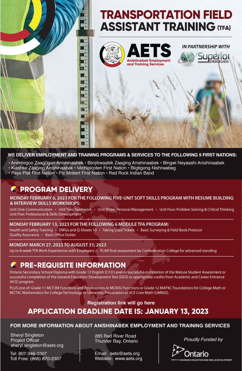 The Transportation Field Assistant Training Program delivered by Superior Strategies + partnered with Confederation College starts on February 6th , 2023. This course will run for 7-weeks and is scheduled to conclude on March 24th, 2023